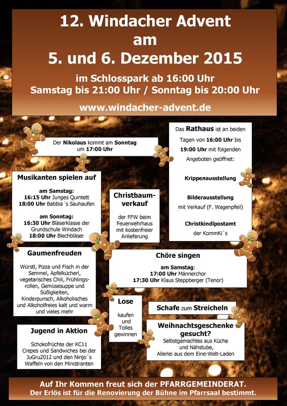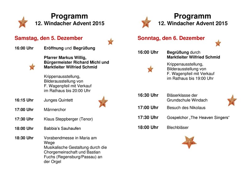 12. Windacher Advent Am 5. und 6. Dezember 2015 fand der 12. Windacher Advent statt. Zu den Presseberichten. [Zeige Vorschaubilder] [Zeige Vorschaubilder]